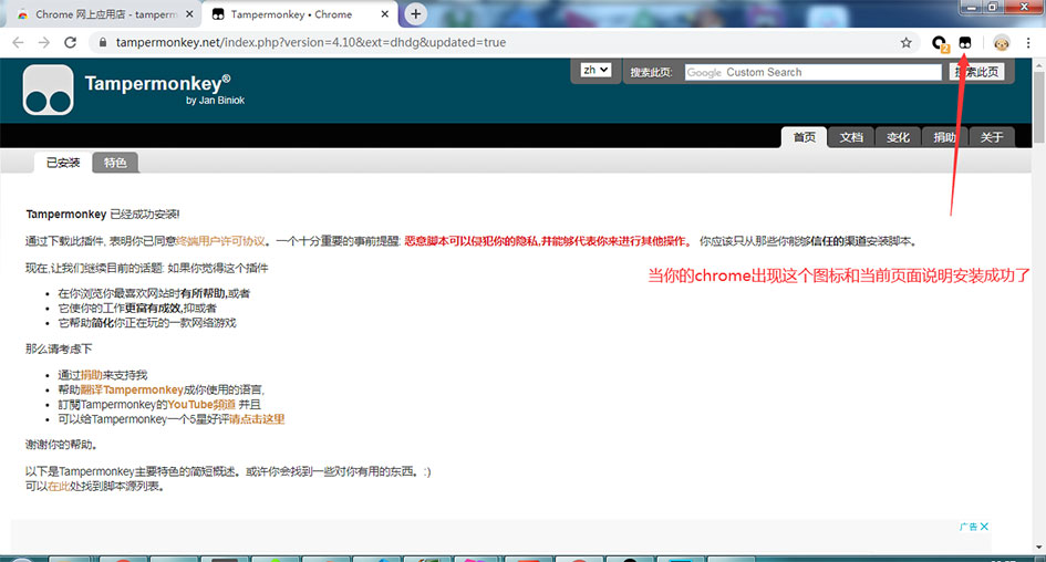 安装好chrome浏览器之后就可以安装Tampermonkey浏览器扩展了,请点击链接 Tampermonkey